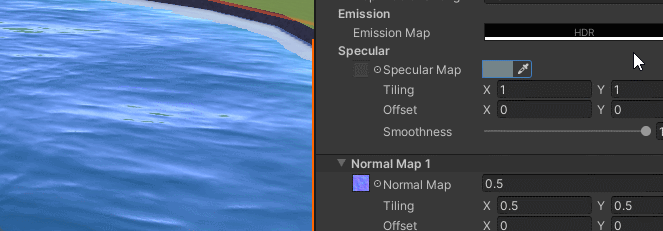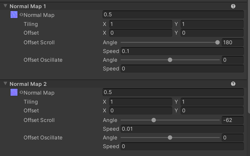 In this shader you get two normal map slots! You can control the strength, tiling, offset, angle, speed, and oscillation of each one to produce different effects. For example, for a river you could increase the speed and adjust the angle so it flows in the direction you want. Having two normal maps scrolling at different angles creates a nice layering effect!
