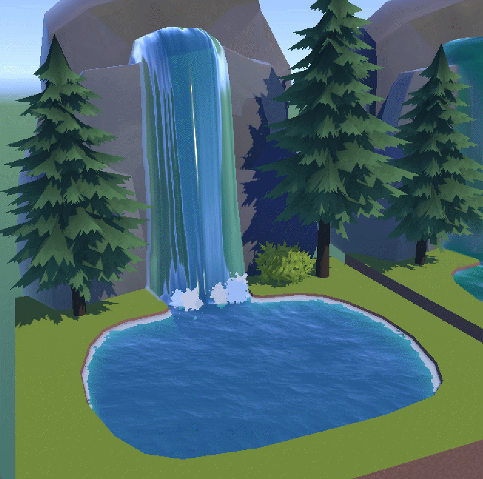 You can utilize your UV layout in order to get different results with your water shader. Having your UV edges closer together will result in faster motion whereas spacing them further apart will result in slower motion. This is great to create the effect of water rushing through a waterfall and slow down at the base.