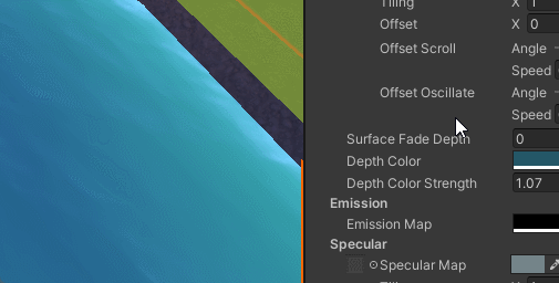 Your surface fade depth is how much the shoreline fades and your depth color strength controls the amount of your depth color