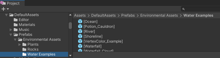 Once you have the default water assets created by the Rec Room art team, you can find them in your Project window in the Assets\DefaultAssets\Prefabs\Environmental Assets\Water Examples