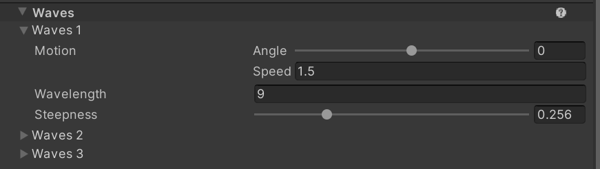Here is where you can add custom textures to the water shader and control the size, speed, angle, and oscillation (Back and forth movement)