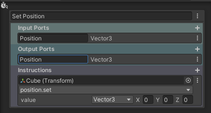 Then, I’ll add an instruction to send the vector3 of the Cube’s position to the Output port. First, I click the + button to the right of Instructions to add a new Instruction. Once again, I drag the game object Cube onto the game object input line and this time  select “position” and “get” (position.get). Last, I’ll select the Output port as the destination for the position.set value.