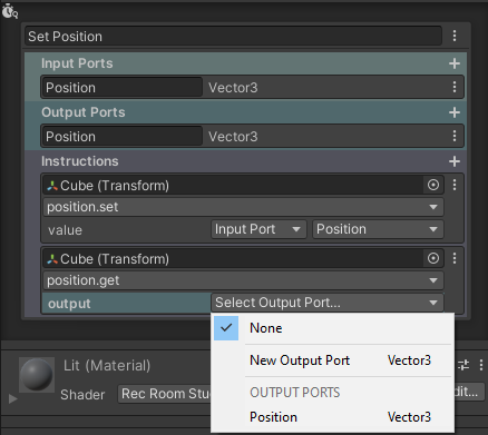 Output Ports are the output pins on your Studio Function chip. Similar to Input Ports, you can add an Output Port by clicking the + next to it, give it a name and select the type you’d like to expose as an output. For this function, I’m going to add an Output Port of the position of my cube.